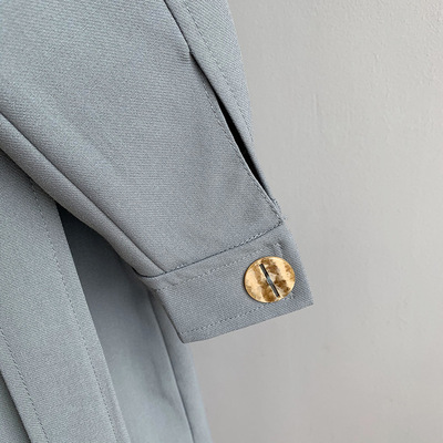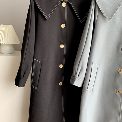 产地:杭州|品牌:橘·芷|货源类别:现货|是否库存:否|面料名称:聚酯纤维|主面料成分:聚酯纤维(涤纶)|主面料成分的含量:71%-80%|图案:纯色|风格:简约|厚薄:普通|版型:宽松型|衣长:普通款(50cm<衣长≤65cm)|领型:翻领/POLO领|袖长:长袖|衣门襟:单排扣|是否有腰带:有腰带|流行元素:纽扣|工艺:无|上市年份/季节:2020年秋季|颜色:黑色,黛青|尺码:9317-M,9317-L